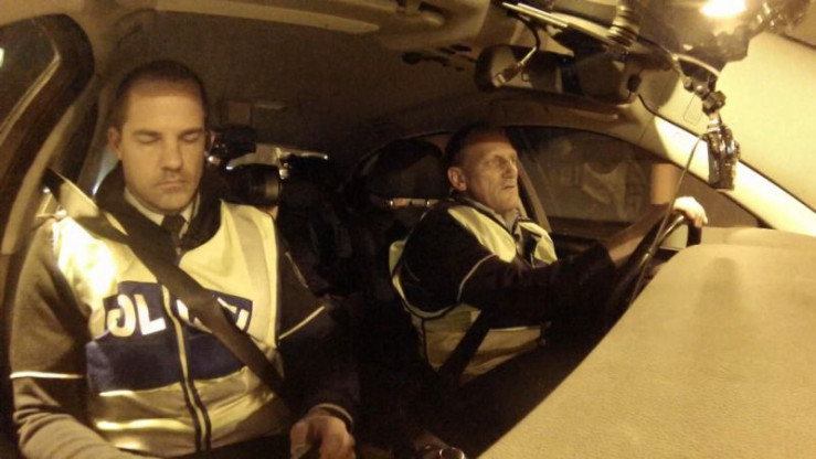 Der Beamte kontolliert ein Auto.