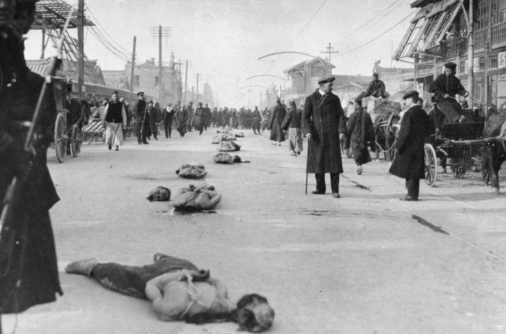 Opfer der chinesischen Revolution liegen 1911 enthauptet auf der Straße.