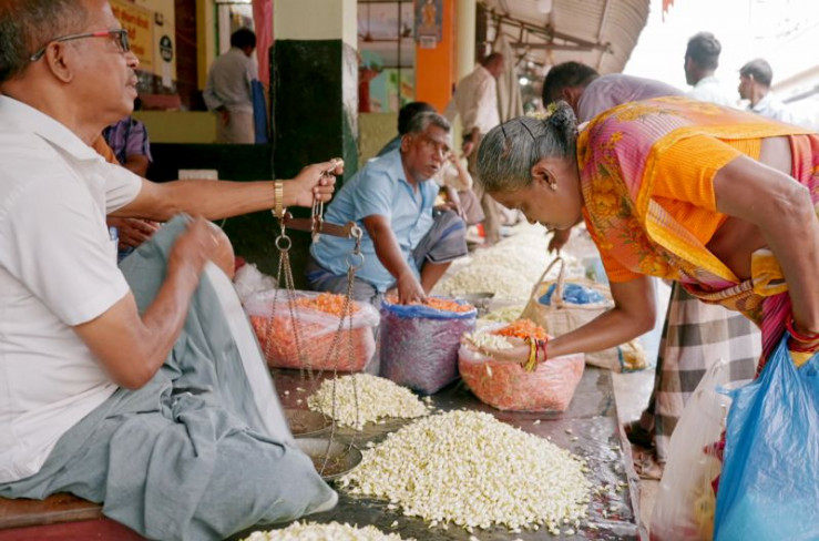 Auf dem Blumenmarkt im südindischen Madurai werden unter anderem Jasminblüten verkauft.