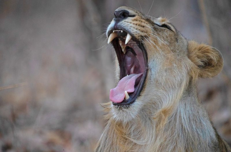 Ein Asiatischer Junglöwe gähnt in der Nachmittagshitze.