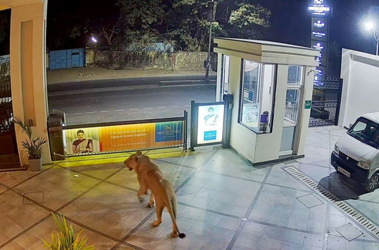 Ein Asiatischer Löwe streift nachts durch ein Wohngebiet.