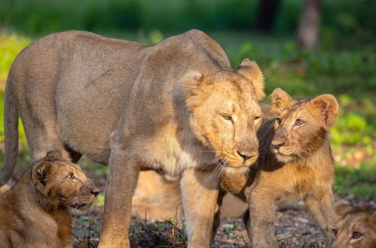 Eine Asiatische Löwin und ihre Jungen spazieren durch den Wald.