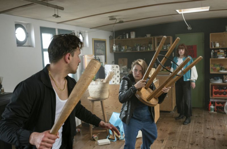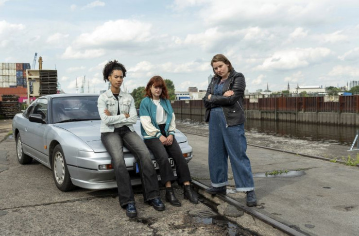 Klara Hauser (Nele Rössler, M.) verteidigt ihre Freundin Sasha Schütte (Kaya Leonie Boch, h.) gegen Oskar Röver (Kris Kwiat, l.) mit allen Mitteln.