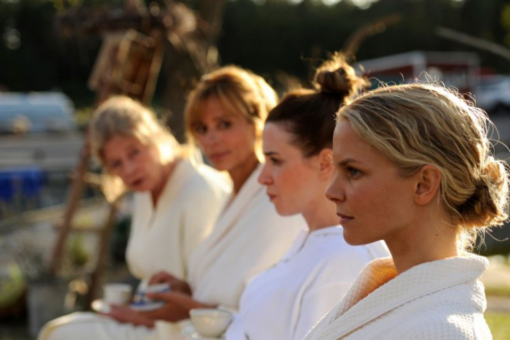 Lilith (Sinja Dieks, r.), Diana (Julia Malik, 2.v.r.), Rhea (Carin C. Tietze, 2.v.l.) und Iris (Lisa Kreuzer, l.), die Frauen vom Larson-Clan, entspannen gemeinsam nach einem Saunagang in der Abendluft.