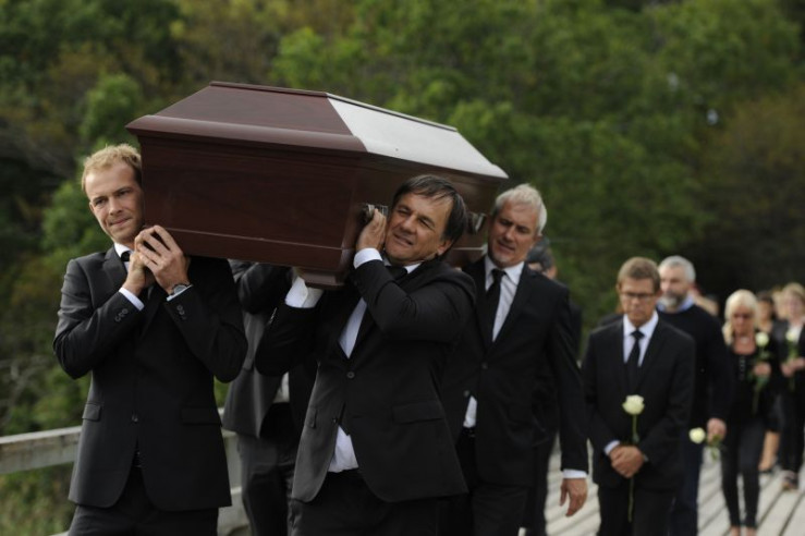 Magnus (Christian Clauß, l.), Peter (Peter Davor, M.) und Thor (Markus Böker, r.) tragen den Sarg des kürzlich verstorbenen Clan-Patriarchen Hagen Blomquist. Im Hintergrund folgt ihnen die Trauergemeinde (Komparsen).