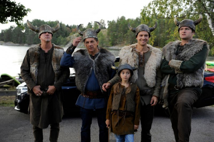 Der Blomquist-Clan, unter anderen bestehend aus dem neuen Patriarchen Peter (Peter Davor, 2.v.l.), seinem Sohn Magnus (Christian Clauß, 2.v.r.), dessen Tochter Marie (Antonia von Schnurbein, M.), seinem Neffen Nils (Frederic Welter, r.) und seinem Bruder Thor (Markus Böker, l.), haben sich für den Tag der offenen Tür beim verfeindeten Larson-Clan als Wikinger verkleidet. Leider sind sie die Einzigen, die verkleidet erschienen sind.