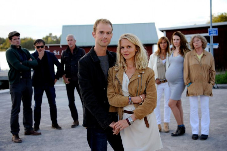 Magnus Blomquist (Christian Clauß, 4.v.l.) und Lilith Larson (Sinja Dieks 4.v.r.) stehen am Hafen. Hinter ihnen beäugen die Mitglieder ihrer beiden Clans - die Blomquists: Nils (Frederic Welter, l.), Peter (Peter Davor, 2.v.l.) und Thor (Markus Böker, 3.v.l.), und die Larsons: Rhea (Carin C. Tietze, 3.v.r.), Diana (Julia Malik, 2.v.r.) und Iris (Lisa Kreuzer, r.), sie äußerst kritisch.
