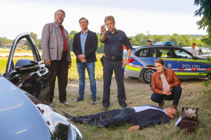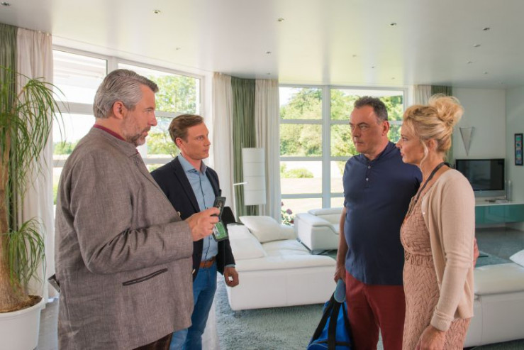 Die Rosenheim-Cops ermitteln, nachdem der Inhaber eines exklusiven Limousinen-Fahrservices ermordet aufgefunden wurde. Von links: Anton Stadler (Dieter Fischer), Christian Bach (Patrick Kalupa), Michael Mohr (Max Müller), Sandra Mai (Sina Wilke).