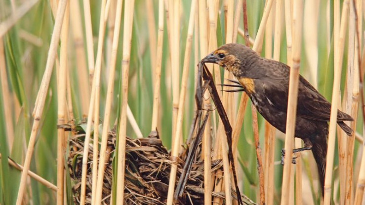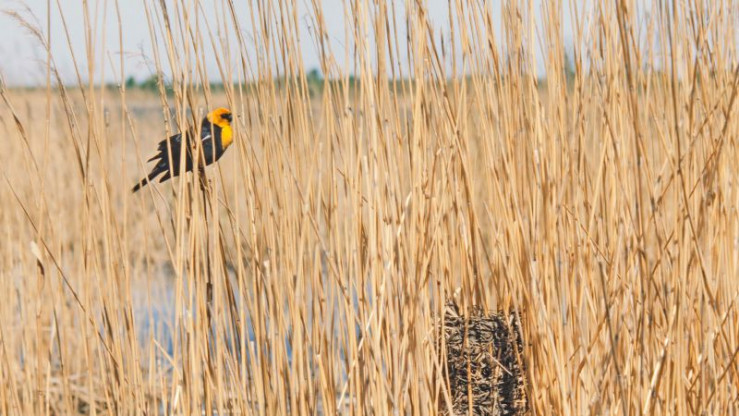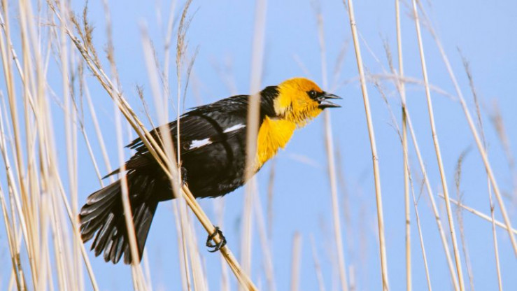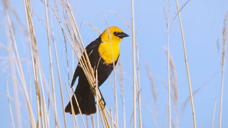 Kanada, wildes, raues Land. Man denkt an die endlosen nordischen Wälder, die schroffen Berge, die klaren Seen, an kaltes, raues Klima. Es gibt in Kanada aber auch weite, ebene Gebiete mit einer Vogelwelt, so farbenprächtig und vielfältig, daß sie uns an die Tropen erinnert. Schwarz und gold. Schick sieht er aus, der Brillenstärling. Sein markantes Federkleid fällt auf, schon beim ersten Hinsehen. Ihn und einige andere bunte und interessante Vögel im Süden Kanadas möchten wir heute vorstellen. Und er ist der Hauptdarsteller, der Brillenstärling mit seiner Blechtrompetenstimme. Den Vögeln an einem Prärie-See gilt also diesmal unsere Expedition.