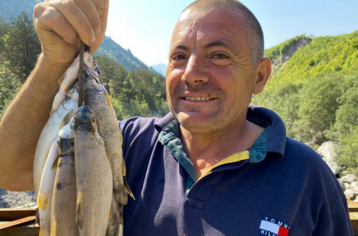 Fischer Ded Nika mit Bachforellen aus einem Gebirgsbach.