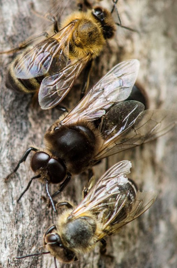 Eine Drohne (M.), und zwei Arbeiterinnen: Dank ihrer großen Komplexaugen, lassen sich die männlichen Drohnen der Honigbienen gut von den weiblichen Arbeiterinnen unterscheiden.