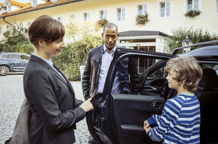 Jerry Paulsen (Peter Marton, M.) spricht vor dem Gasthof zur Post mit Felicitas Beck (Dagny Dewath, l.) während ihr Sohn Florian (Anton Unertl, r.) in den Wagen steigt.