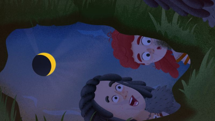 Mimo und Leva entdecken in einer Pfütze, was es mit der verschwundenen Sonne auf sich hat.