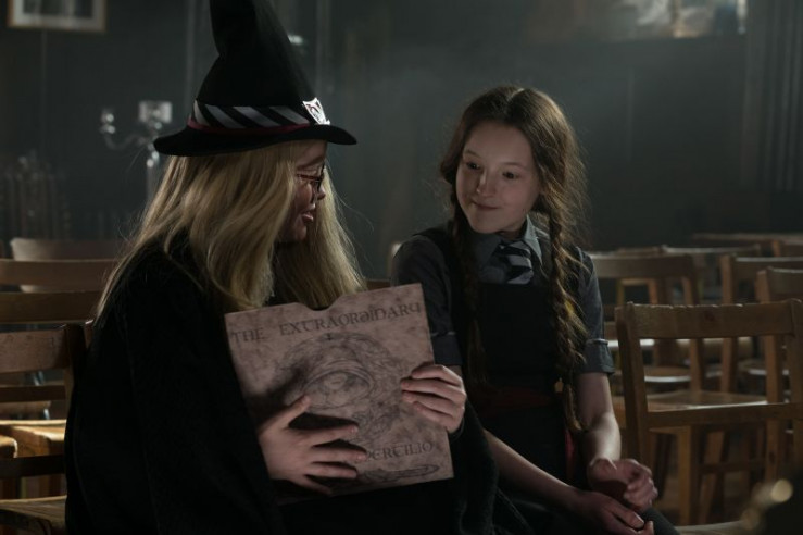 Mildred (Bella Ramsey, rechts) kann es nicht fassen, dass Olli (Milo Panni) ein großer Fan der berühmten Sängerin Esper Vespertilio ist, die am Abend ein Konzert an der Graustein-Akademie geben will.