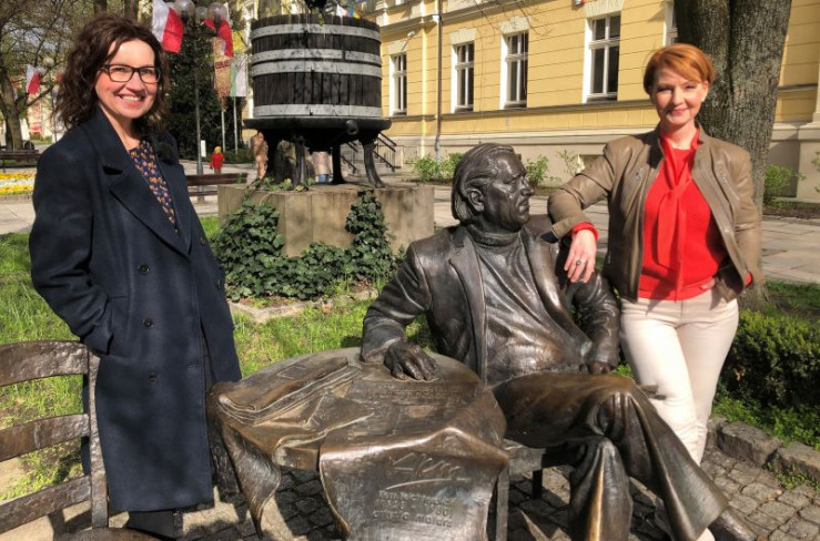 Edyta und Beate vor dem Museum zum Lebuser Land in der Altstadt von Zielona Góra. U.a. finden sich viele Bronzeskulpturen in der 140 000-Einwohner-Stadt. Darunter allein 65 Bacchus-Figuren.