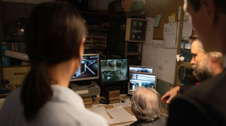V. li. n. re.: Graciana (Eva Meckbach), Fernandes (Carlos Vieira Almeida), Lost (Jan Krauter) und Carlos (Daniel Christensen) schauen sich die Aufnahmen der Überwachungskamera vom Tatort an