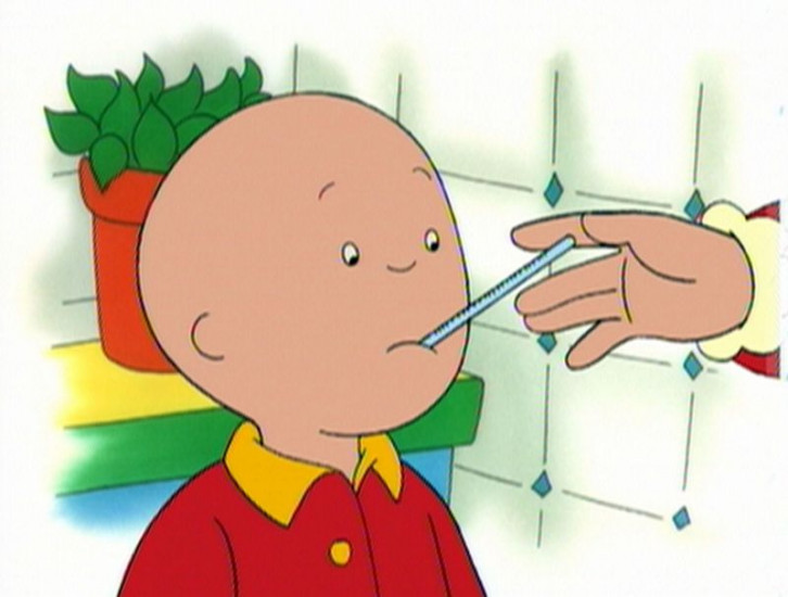 Der kranke Caillou bekommt von seiner Mutter Medizin.