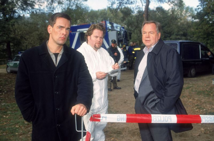 Die Beamten untersuchen den Tatort. PTU Weis (Georg Prokop, Mi.) informiert Kommissar Bonhoff (Wolfgang Krewe, li.) und Kommissar Kehler (Wolfgang Bathke) über seine ersten Erkenntnisse.