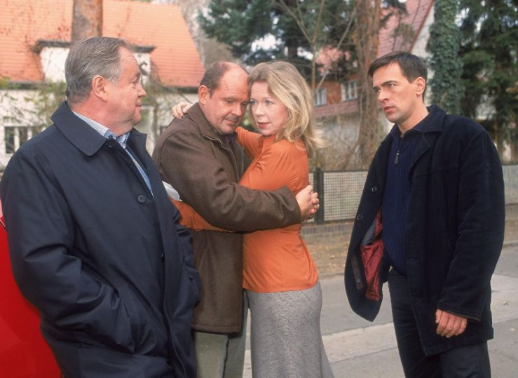 Das Ehepaar Franke (August Schmölzer, Marion Kracht) versucht jede Schuld an der Tat vor den Ermittlern Kehler (Wolfgang Bathke, li.) und Bonhoff (Wolfgang Krewe, re.) zu leugnen, doch die glauben, dass Bernd Franke durchaus in die Tat verwickelt ist.