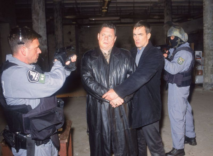 Bonhoff (Wolfgang Krewe, 2.v.re.) und das SEK überwältigen den Zuhälter Makarow (Ronald Nitschke, 2.v.li.).
