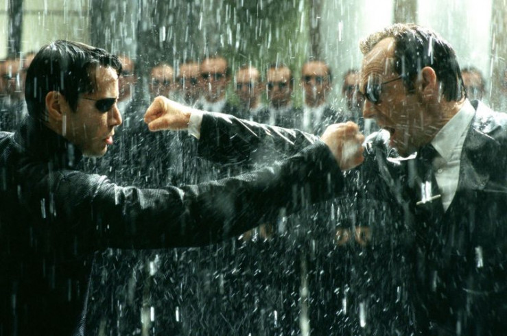 Neo (Keanu Reeves, l.) und Agent Smith (Hugo Weaving) wurden vom Architekten als Äquivalente konzipiert, um das Gleichgewicht in der Matrix zu halten. Es kommt zum entscheidenden Kampf...
