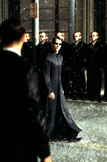 Neo (Keanu Reeves, M.) durchschreitet die Reihe der Agent Smith-Klone.