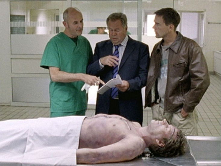 Dr. Duhler (Klaus Schindler) überrascht die Kommissare Kehler (Wolfgang Bathke, M.) und Bonhoff (Wolfgang Kehler) mit einem Obduktionsergebnis, das alle Ermittlungen auf den Kopf stellt.