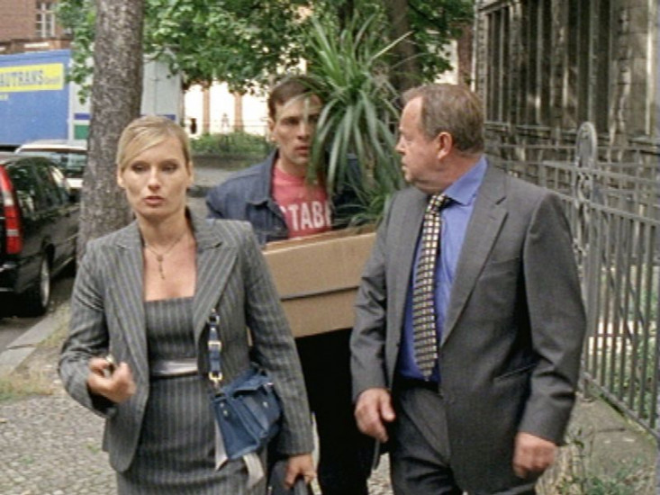 Bonhoff (Wolfgang Kehler, M.) und Kehler (Wolfgang Bathke) versuchen Tatjana Kreutz (Lucia Gailova) zu verhören. Doch Tatjana läßt die beiden nur ihre Akten tragen...