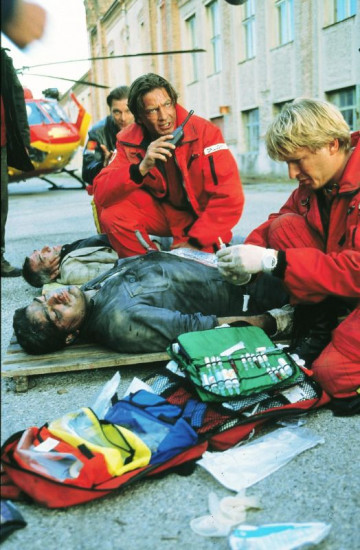 Dr. Lüdwitz (Rainer Grenkowitz, l.) versorgt gemeinsam mit Pilot Thomas Wächter (Manfed Stücklschwaiger, h.r.) den schwer verletzten Markus Bostel (Sebastian Ströbel). +++ Die Verwendung des sendungsbezogenen Materials ist nur mit dem Hinweis und Verlinkung auf RTL+ gestattet. +++