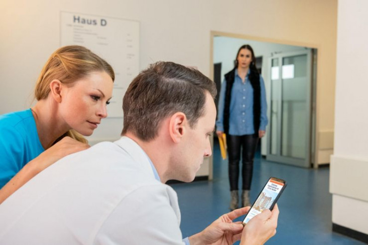 Ella (Ines Quermann, l.) erhält einen Besorgnis erregenden Anruf, der auch Dr. Matthias Fink (Martin Gruber, r.) etwas angeht. Kollegin Nadine Thielemann (Jana Schölermann, M.) hört zu.