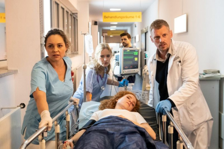 Ella (Ines Quermann, l.), Kiki (Valerie Huber, 2.v.l.) und Dr. Matthias Fink (Martin Gruber, r.) schieben ihre Kollegin Meike (Sarah Hannemann, 3.v.l.) in den Not-OP. Kollege Karim (Nassim Avat, 2.v.r.) sieht besorgt zu.