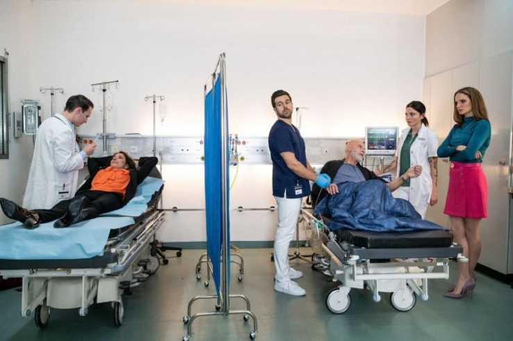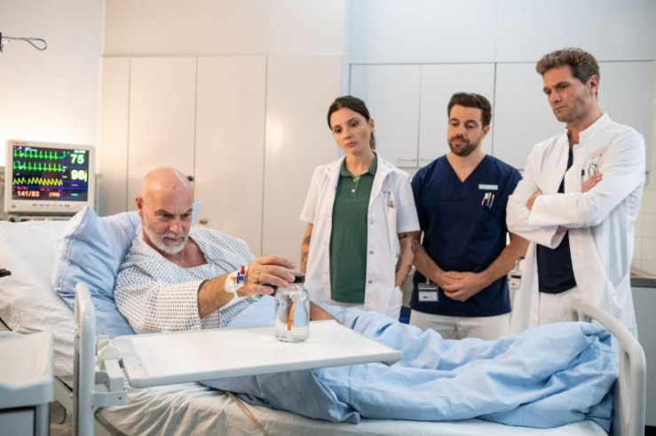 Dr. Jan Kühnert (Marc Dumitru, l.) kümmert sich um die Kopfverletzung von Ex-Ehefrau Claudia Ott (Berrit Arnold, 2.v.l.). Zur gleichen Zeit behandeln Pfleger Karim (Nassim Avat, 3.v.l.) und Dr. Leonie Mertens (Linda Marlen Runge, 2.v.r.) den Geschäftsmann Kai Ott (Simon Licht, 3.v.r.). Seine neue Ehefrau Sophie Ott (Nora Huetz, r.) steht verärgert bei ihm.