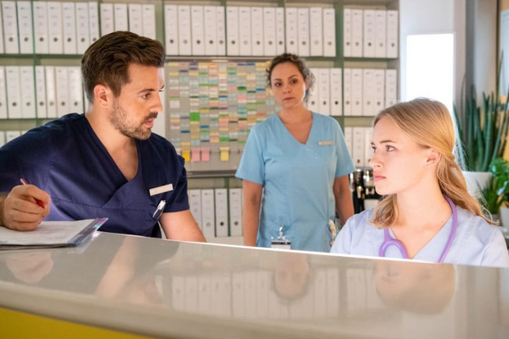 Oberschwester Nadine (Jana Schölermann, l.) sucht zusammen mit Dr. Jan Kühnert (Marc Dumitru, M.) nach Beweisen für das dunkle Geheimnis von Dr. Mertens, als plötzlich Samira (Sila Sahin-Radlinger, r.) auftaucht.