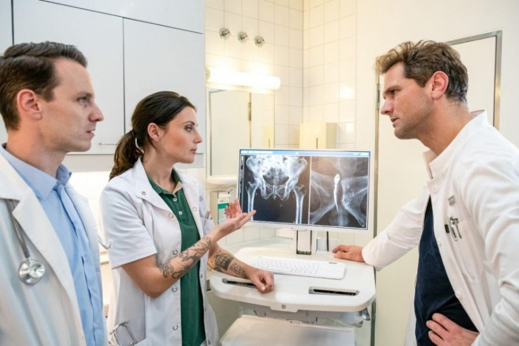 Die drei Ärzte Dr. Jan Kühnert (Marc Dumitru, l.), Dr. Leonie Mertens (Linda Marlen Runge, M.) und Dr. Sebastian Sander (Oliver Franck, r.) tauschen sich über den ungewöhnlichen Befund auf dem Röntgenbild von Kai Ott(Simon Licht) aus.