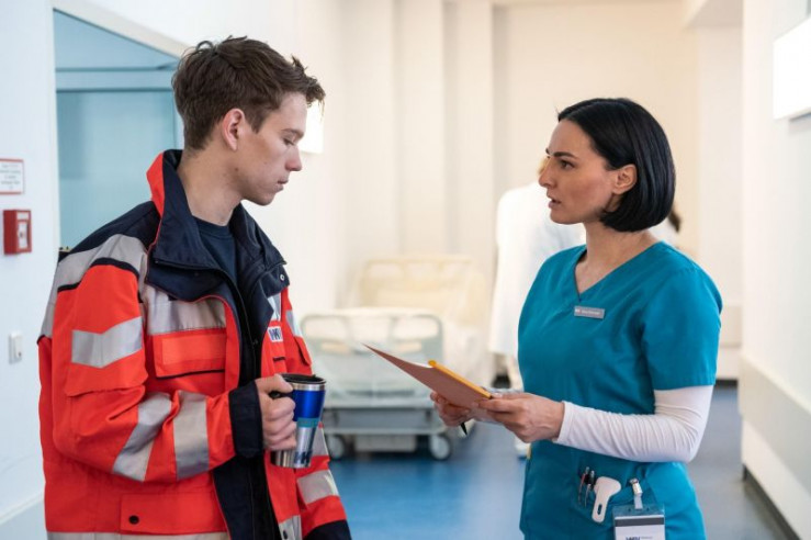 Leonie Mertens (Linda Marlen Runge) hat Dr. Jan Kühnert (Marc Dumitru) eine OP weggeschnappt. Jetzt diskutieren sie auf dem Flur.