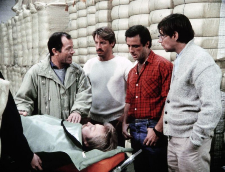 Lieutenant Quinlan (Jack Ging, li.) verdächtigt das Riptide-Trio Cody (Perry King, 2.v.li.), Nick (Joe Penny) und Murray (Thom Bray, re.), in den Mordfall verwickelt zu sein. +++ Die Verwendung des sendungsbezogenen Materials ist nur mit dem Hinweis und Verlinkung auf RTL+ gestattet. +++