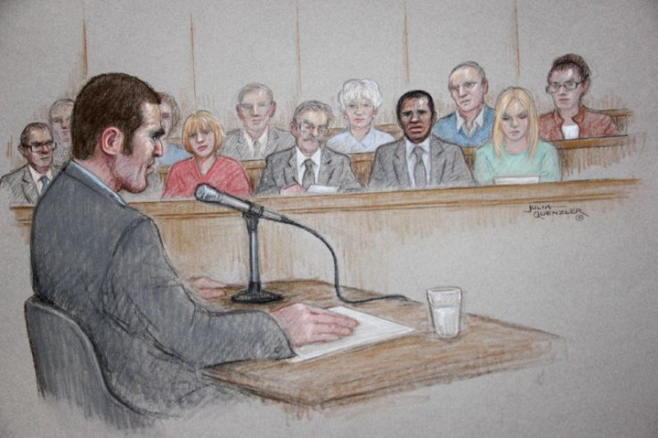 Eine Gerichtszeichnung zeigt Daniel Reece im Zeugenstand. Er hatte mit Lashley im Gefängnis gesessen und dieser hatte ihm gegenüber den Mord an Janie Shepherd gestanden.