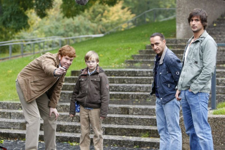 Herzberger (Dietmar Huhn, li.) und Bonrath (Gottfried Vollmer, re.) sind durch ihr Gespräch mit dem Techniker der Past, Hartmut (Niels Kurvin), abgelenkt und bemerken nicht, wie der kleine Felix (Mateo Wansing Lorrio, hi.) sich aus dem Staub macht...