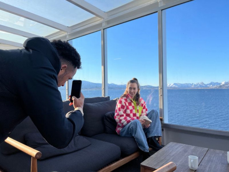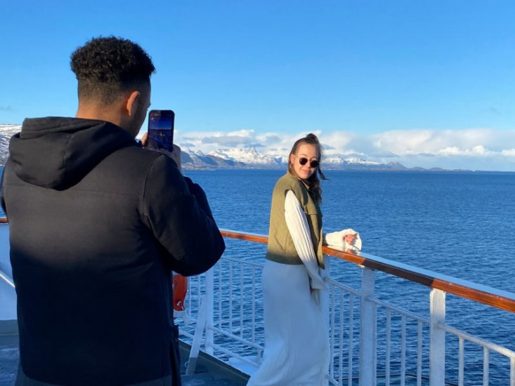 Influencerin Henni nutzt die zwölftägige Hurtigruten-Tour, um ihrer Community ständig neue Eindrücke von der Reise zu bieten. Ob Hundeschlitten-Fahrt, Shopping-Tour in Trondheim oder Besuch in Norwegens kleinster Bar - Hennis rund 18.000 Follower sind immer digital dabei. Der Moment im Outdoor-Pool mit romantischem Sonnenuntergang jedoch ist nur für sie und ihren Freund Cedric bestimmt.