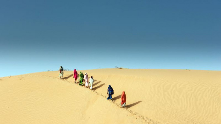 Eine Gruppe von Kanurifrauen nahe Indil, Sahel, Niger auf dem Weg Feuerholz zu sammeln.