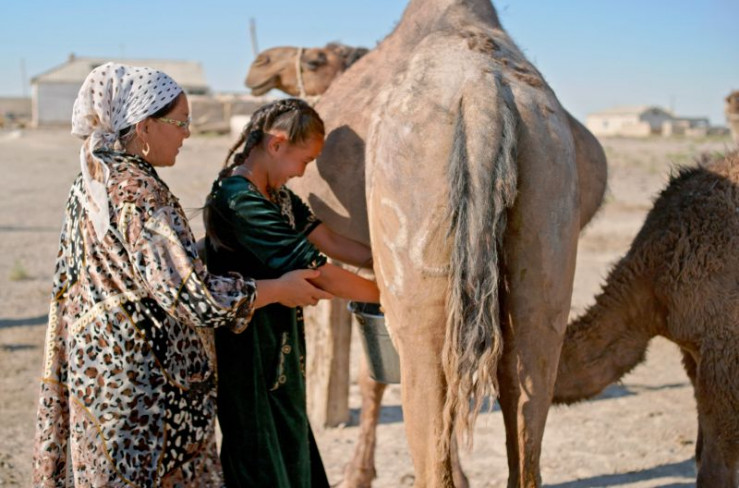 Die 13-jährige Nazyirke (r.) soll das Kamelmelken von ihrer Mutter Salikha (l.) lernen.