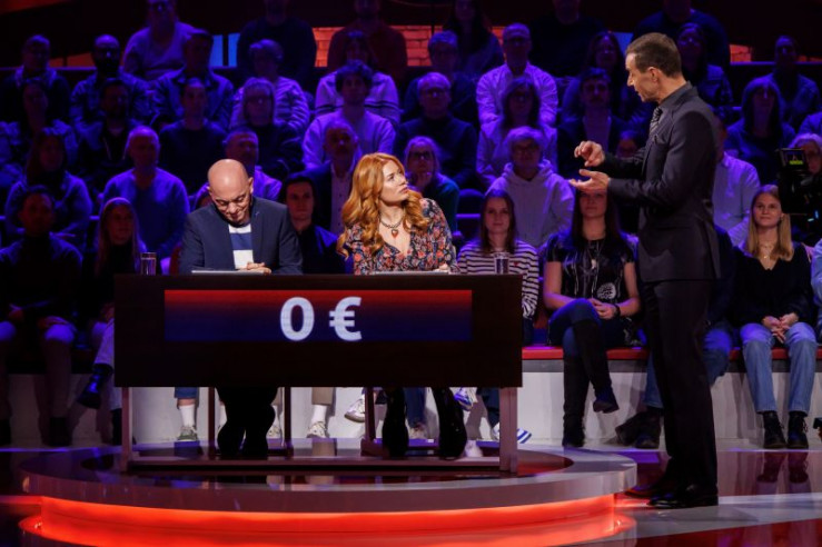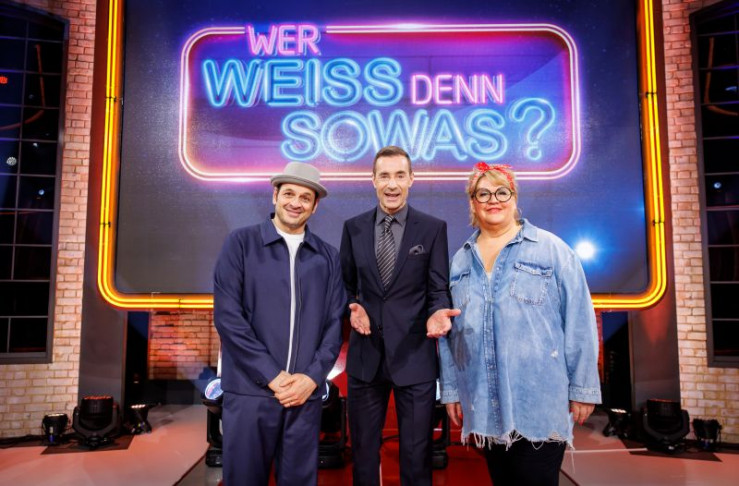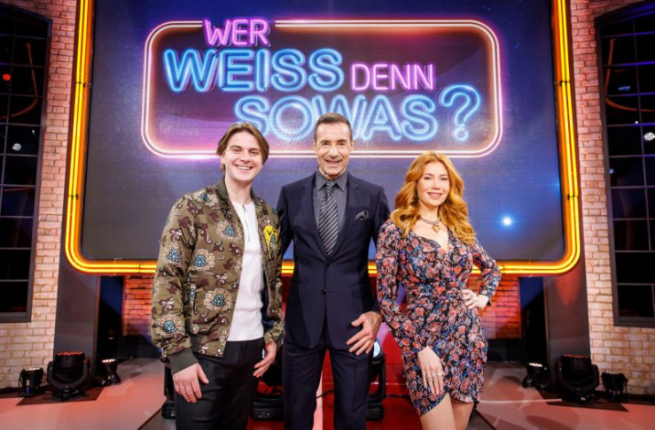 Moderator Kai Pflaume (M.) mit Palina Rojinski und Vincent Gross.