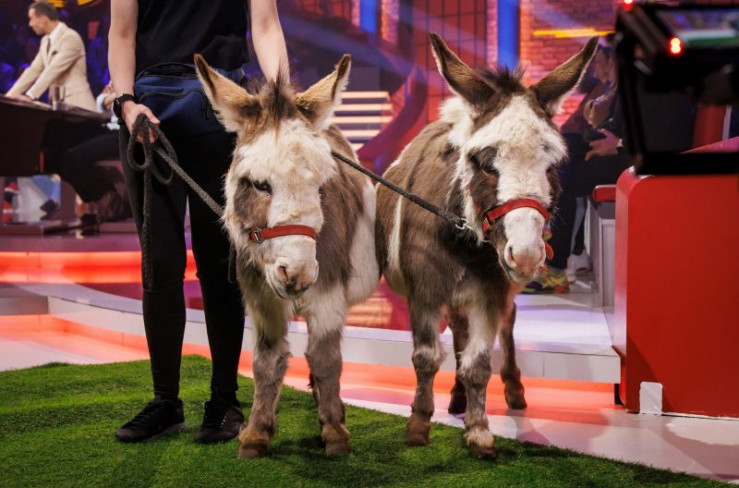 Moderator Kai Pflaume und eine Frau mit einem kleinen Känguru in einem Beutel.