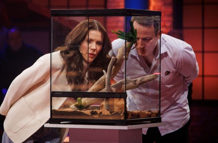 Victoria Swarovski und Wotan Wilke Möhring begutachten ein Tier in einem Terrarium.