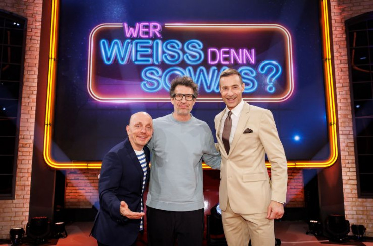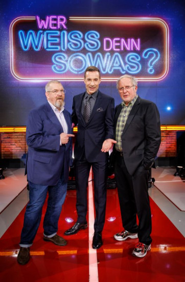 Moderator Kai Pflaume (M.) und seine Teamkapitäne Bernhard Hoëcker (l.) und Wotan Wilke Möhring (r.).