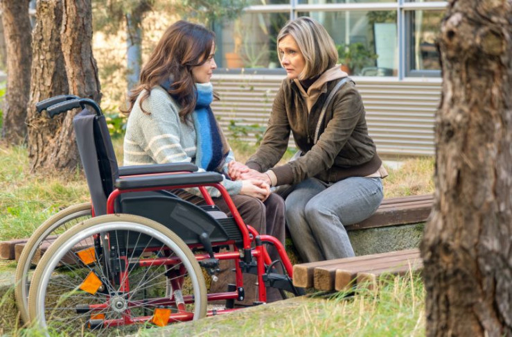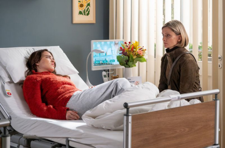 Miriam Schneider (Christina Petersen, li.) beobachtet kurz eine Frau (Alexandra Finder, re.), die ein etwas gereiztes Telefonat zu führen scheint.