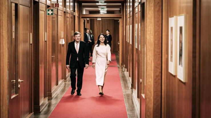 Am Tag der Amtsübergabe führt die ehemalige Außenministerin Annalena Baerbock den neuen Außenminister Johann Wadephul über den Ministerflur des Auswärtigen Amtes in sein neues Büro.