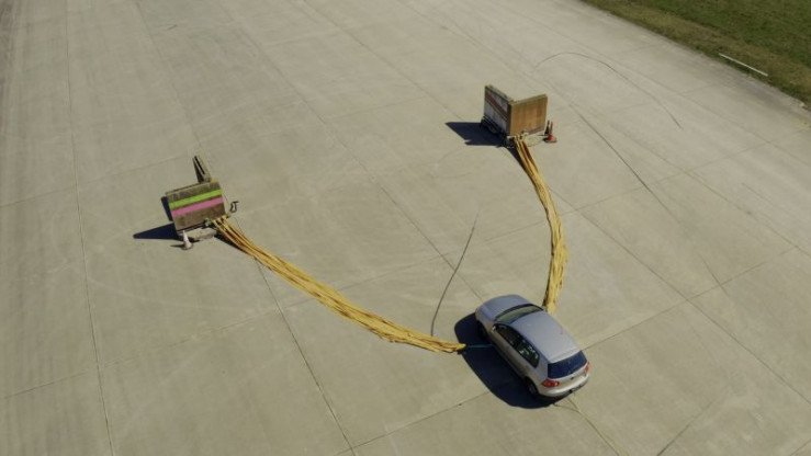 Jörg & Cheyenne are challenged to build a huge slingshot that will catapult a car down a racetrack. Cheyenne needs to weld an internal framework and release system so the car doesn't rip apart. How will the rubber-powered car fare against a Mustang?