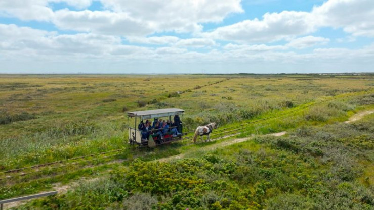 Quer über die Insel zum Weststrand - ganz ohne Diesel und Motorenöl: Die Spiekerooger Pferdebahn ist die absolut zuverlässige Verbindung auf der Schiene seit 1885.