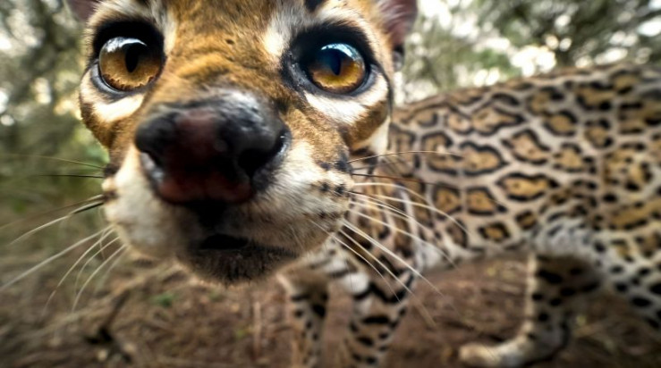Aus nächster Nähe inspiziert ein Ozelot die Kamerafalle der Filmcrew.